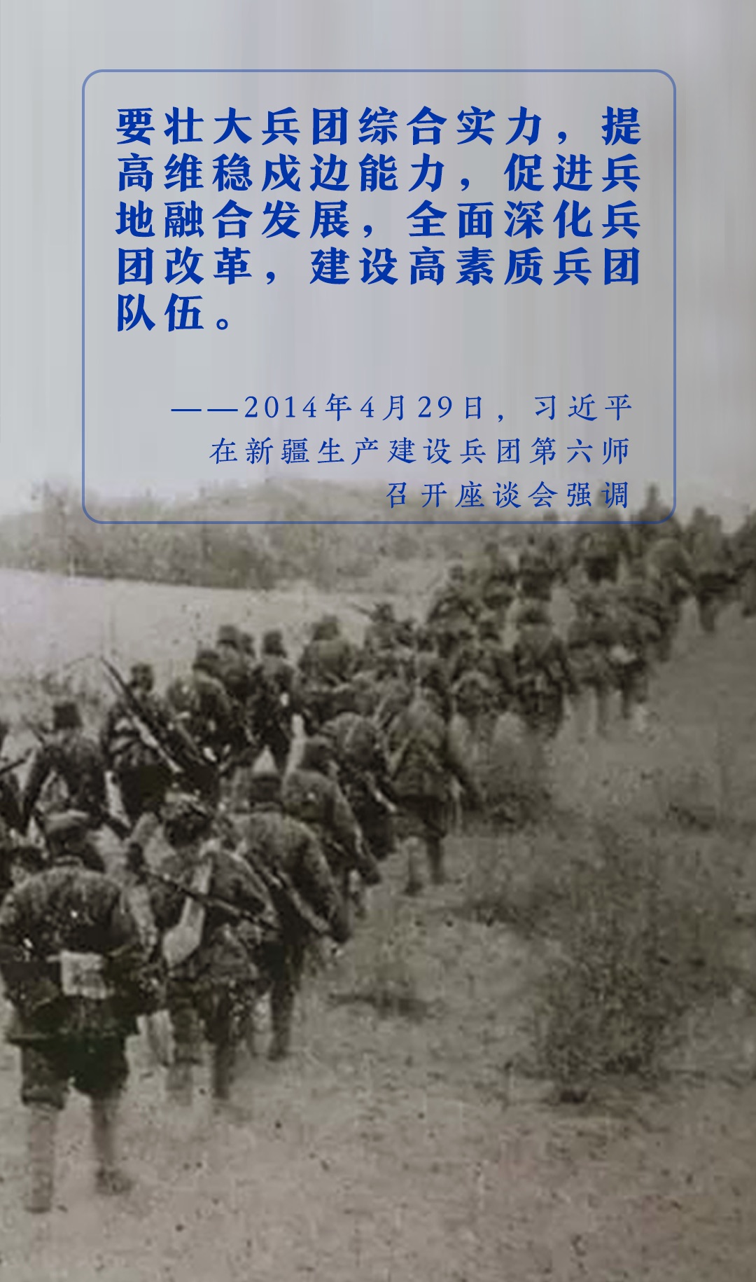 一代代各族儿女发扬胡杨精神、兵团精神,无畏艰险、勇往直前、甘于奉献,奋力为建设一个团结和谐、繁荣富裕、文明进步、安居乐业的中国特色社会主义新疆作出贡献。