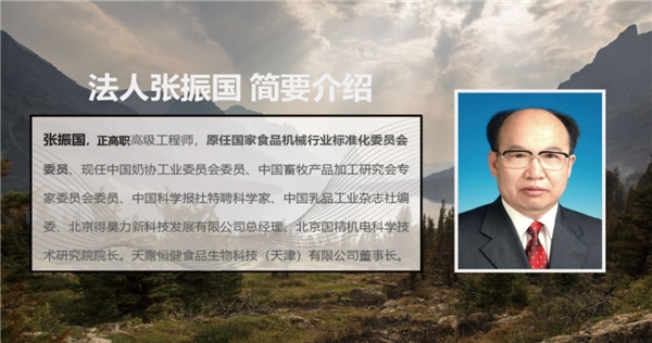 张振国 教授级高级工程师、 研究员。原任国家食品机械行业标准化委员会委员、中国奶协工业委员会委员、中国畜牧产品加工研究会专家委员会委员、现任中国科学报社特聘科学家、中国管理科学院特聘研究员、中国乳品工社编委、现任北京得昊力新科技发展有限公总经理、北京国精机电科学技术研究院院长,天露恒健食品生物科技(天津)有限公司董事长。