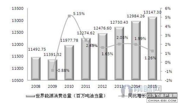 图表:2008-2015年全球能源消费总量及同比增速(单位:百万吨油当量,%)