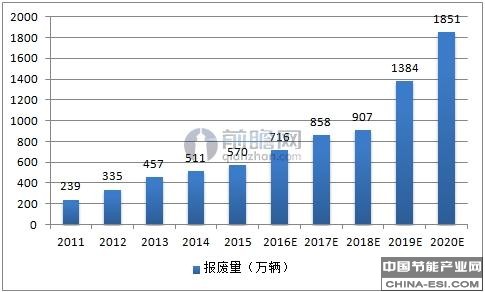 我国汽车的使用年限一般为8-10年,参考行驶里程为50-60 万公里。随着汽车保有量的持续增长,废旧汽车报废量也将相应大幅增加。前瞻产业研究院发布的《报废汽车回收行业市场前瞻与投资分析报告》指出,按照成熟市场报废汽车占汽车保有量6%-8%的水平计算,中国汽车报废高峰已临近,2017年废旧汽车理论报废量将突破800万辆,2019年左右将超过1300万辆,并保持高速增长。