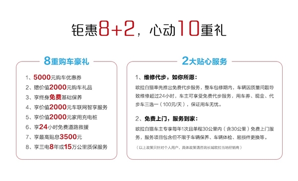 同时还在天猫、B站和抖音等平台开启了欧拉白猫专属服务政策,以及9.9元抵5000元购车优惠券、赠送价值2000元购车礼品等8重购车豪礼+两大贴心服务,实打实地减轻了后浪少年的购车压力。