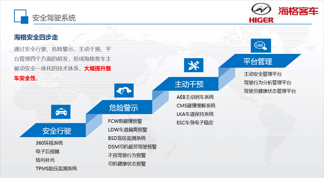 随着社会的不断发展,人们对出行安全的要求越来越高,客运企业也在安全上投入更大精力,客车生产企业作为车辆的提供商更是在政府、市场需求和社会责任的三重推动下加大了对客运安全的投入和探索。从“安全用心 服务贴心”到“安全为本”,苏州金龙持续多年深耕客车安全,倡导全行业安全意识链的打造,并利用先进的智能网联技术,提出“海格安全四步走”,通过安全行驶、危险警示、主动干预、平台管理四个方面的研发,形成了海格客车四位一体的智能安防体系,大幅提升了行车安全性。
