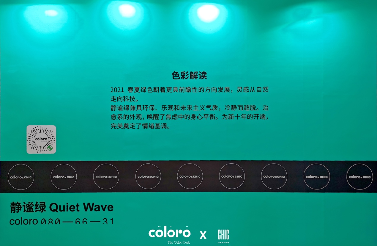 本次CHIC2020大湾区展的官方主色调为:静谧绿(Quiet Wave),由中国应用颜色体系COLORO与CHIC合作定制,灵感来源于2021春夏色彩趋势,绿色从自然走向科技,突出体现冷静、超脱的外观,兼具环保、乐观和未来主义的气质奠定了新十年的情绪基调。