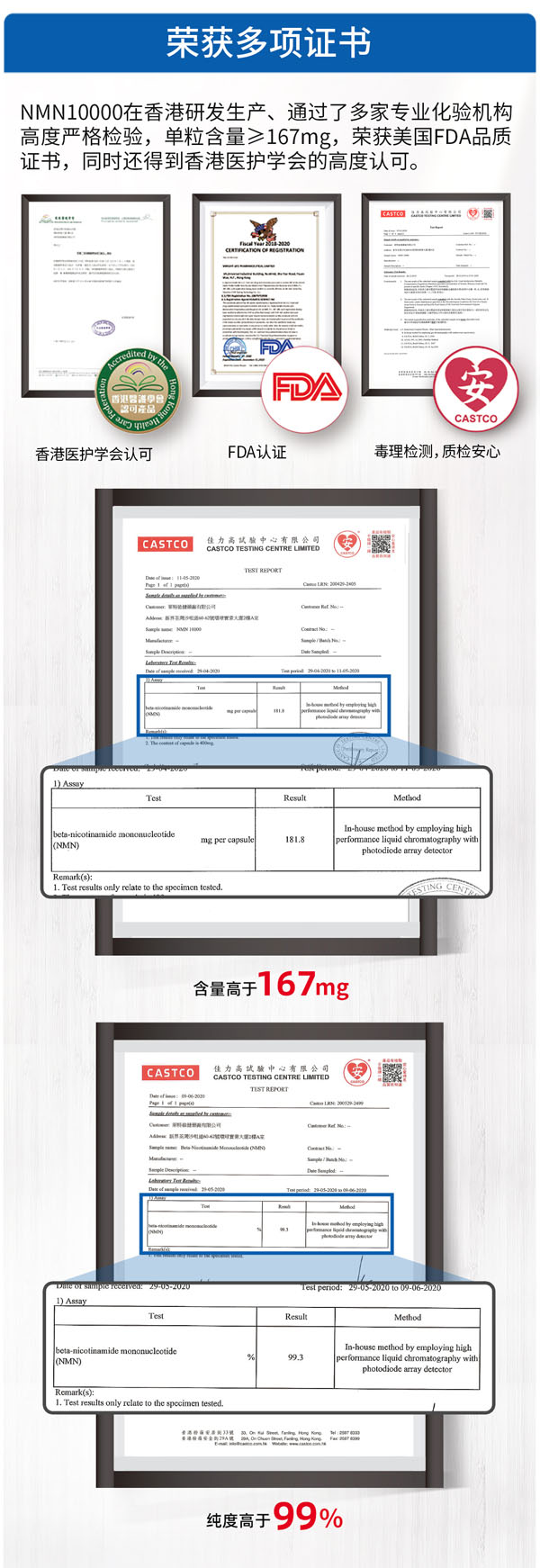 除了产品的品牌资质,产品本身的质量检测和认证也是考核产品本身的重要标准。莱特维健NMN每瓶含量高达10000毫克,纯度超出99%,在同类产品中名列前茅,而香港医护协会推荐、香港CASTCO的认证检测证书以及美国FDA证书更是保证其过硬的产品质量。