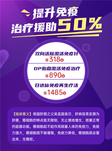 提升免疫力向来是肝病患者康复的首要前提,而肝病患者普遍免疫力低下,为了帮助肝病患者提升免疫力,早日战胜病魔,华西肝病研究所特提供免疫疗法五折的补助政策。双向活肽激活免疫针(原价636.9),DP胎盘激活免疫治疗(原价1781元),日达仙免疫再生疗法(原价2970元),三种免疫针任意选。