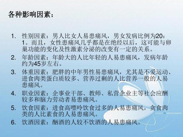 (2)多见于中老年男子,可能有痛风家族史。常因劳累、暴饮暴食、食用高嘌呤饮食、饮酒及外感风寒等诱发。