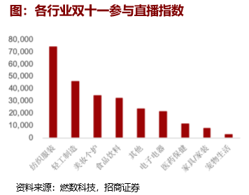 今年3月,“招商证券”曾发布一份调研报告称,各行业双十一参与直播指数前三名为纺织服装、轻工制造、美妆个护,电子电器类只排第六。