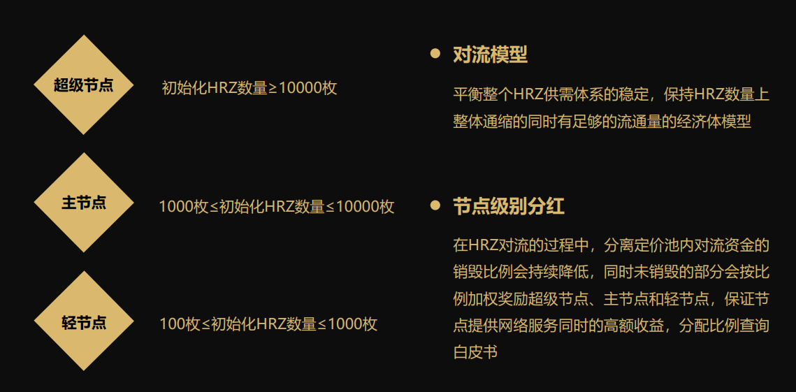 HRZ币遵循对流模式,在HRZ对流的过程中,分离定价池内对流资金的销毁比例会持续降低,同时未销毁的部分会按比例加权奖励超级节点、主节点和轻节点,保证节点提供网络服务同时的高额收益。