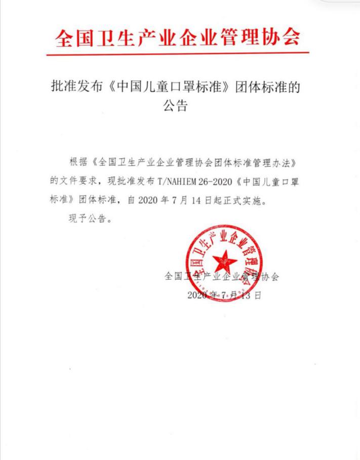 目前国内疫情逐渐稳控,但局部地区仍存在复发的风险。在9月秋季新学期全国各大幼儿园以及中小学即将面临复课复学,市面上却紧缺相应的儿童消毒剂和儿童口罩的情况下,全国卫生产业企业管理协会不久前发布了儿童消毒剂团体标准(T/NAHIEM 23—2020《中国儿童消毒剂标准》)、儿童口罩团体标准(T/NAHIEM 26—2020《中国儿童口罩标准》),为推动全国儿童消毒剂和儿童口罩的规范化生产提供行动指南。