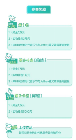 7月25日-8月5日,前往全民K歌APP全棉时代#我耀大声唱#大赛页面,选择心属曲目翻唱,录制歌曲后上传至活动页面,即可开启比赛打榜。参与大赛瓜分百万大奖(百万大奖指整个活动奖池总价值,包含现金、礼品券、优惠券/券包、积分的累计,全棉时代在法律允许范围内拥有本活动解释权),还有机会在8月18日全棉音乐会与Jeffrey零距离接触!