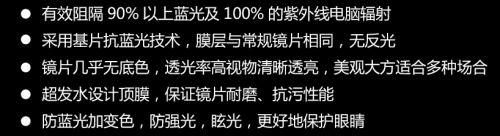 防紫外线:防紫外线和辐射,紫外线越强变色越深。保护眼睛不受紫外线侵害