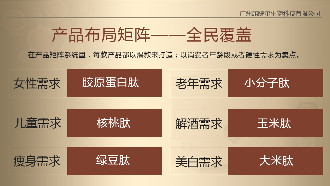 自进入大健康市场以来,益品达健始终秉承“打造民族健康肽品牌,树立健康行业新标杆”这一展望,不吹嘘、不浮夸,脚踏实地做好产品、好品牌。纵观益品达健三款产品不难发现,每一款产品针对的人群和硬性需求都不同。在产品矩阵系统里,益品达健的每款产品都以爆款打造,以消费者年龄和硬性需求为卖点,不断实现全线产品“全民覆盖”的目标。