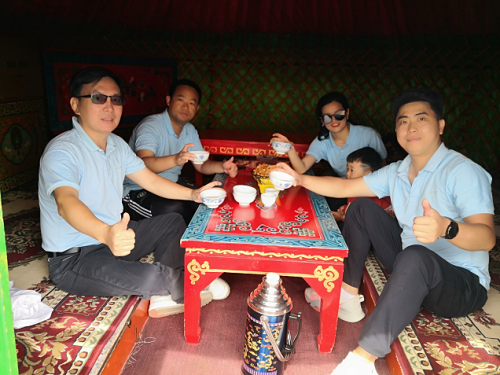 到了傍晚时分,大家抵达蒙古汗城景区,享用牧民家蒙餐风味餐。店家很热情的招待,里面很多蒙古食物都是大家第一次见与品尝,特别是奶类品、烤全羊、羊血肠和沙葱等。