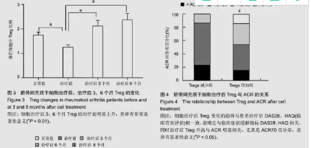 研究发现,类风湿关节炎患者Treg在干细胞疗法治疗后3-6个月较治疗前明显上升(P<0.01)),其与临床症状的缓解DAS28、HAQ、ACR相关,CD4 +Treg比率在细胞治疗后3个月增高明显(P < 0.05),6-8个月与治疗前比也显示升高趋势。