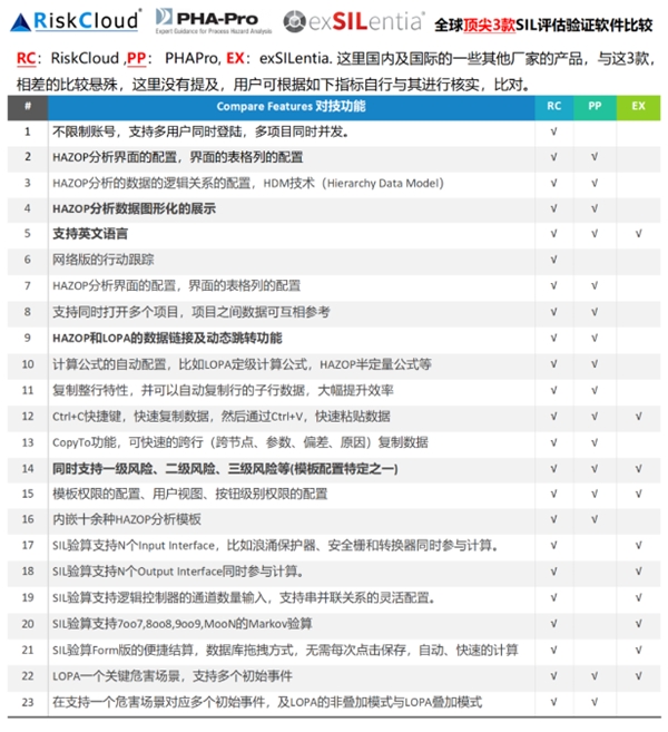 目前在国内和国际市场具有代表性的主流PHA分析软件有三款,分别为:Sphera公司的PHA-Pro、Exida公司的exSILentia和上海歌略的RiskCloud无忧风险云risk5u.com。