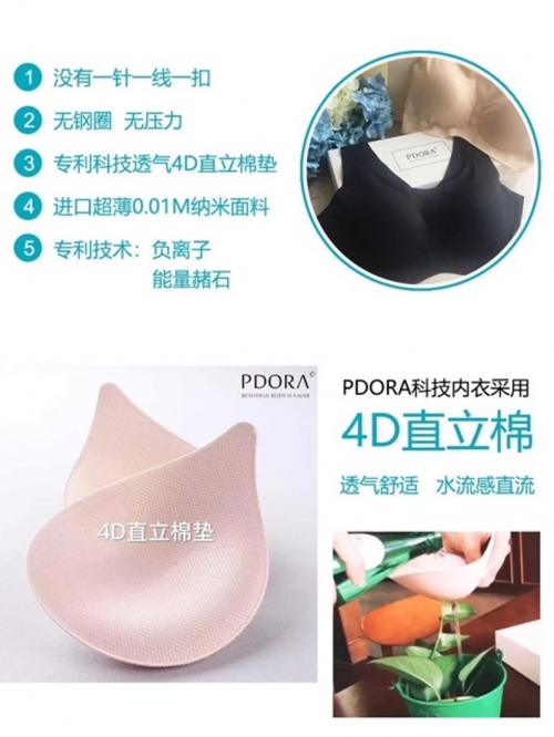 第三个建议,平时可以多做做乳房按摩,保持适中的力度,疏通乳房周围的经络与血管,达到一个疏通气血的目的。或者是可以选择做一些胸部肌肉的拉伸健美等运动。让胸部的肌肉更加丰满,保持一个完美地曲线。再加上PDORA科技内衣的提拉、水滴形包围的效果,轻松塑造出迷人的胸型!