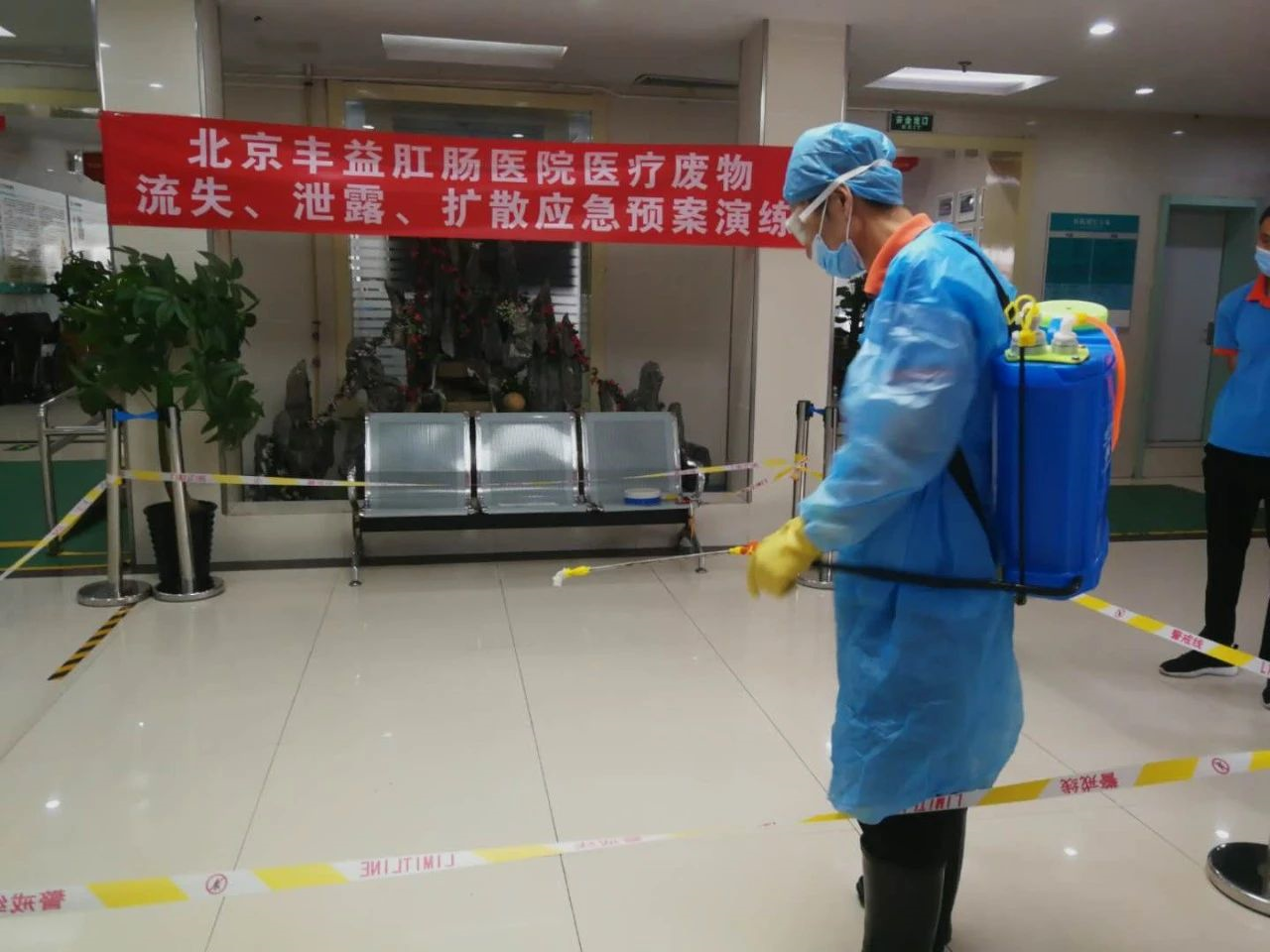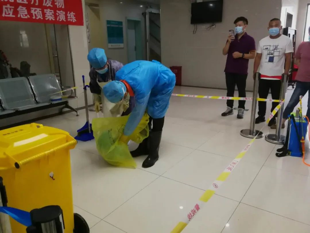 为进一步提高我院医疗废物院内意外泄露、流失、扩散后的防控应急处置能力,确保医疗废物在院内收集、运送过程的安全性,2020年7月30日下午,我院在一楼院内门诊大厅开展了医疗废物应急处置演练,院护理部总监张彩霞总监主持了本次演练,院长吴萍、医疗废物专职管理员、医疗废物收集员、保安、管理负责人等人参加了本次演练。