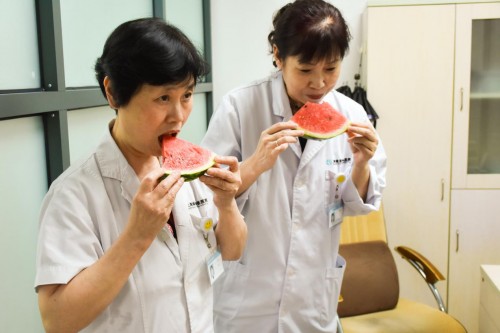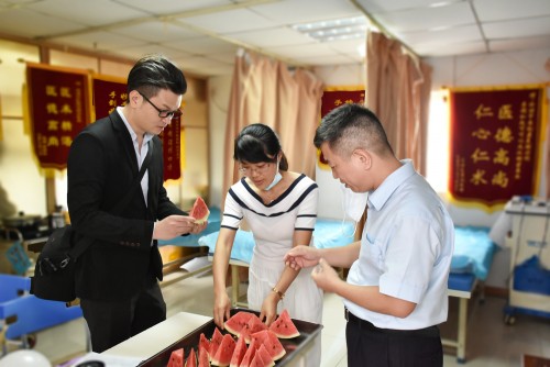 随后,医务科的同志将西瓜切成片分好等份,不仅让全院工作人员感受到徐女士的浓浓情意,也把这份真挚情意传递给当日到诊患者——感恩分享现场,和患者一起品尝。