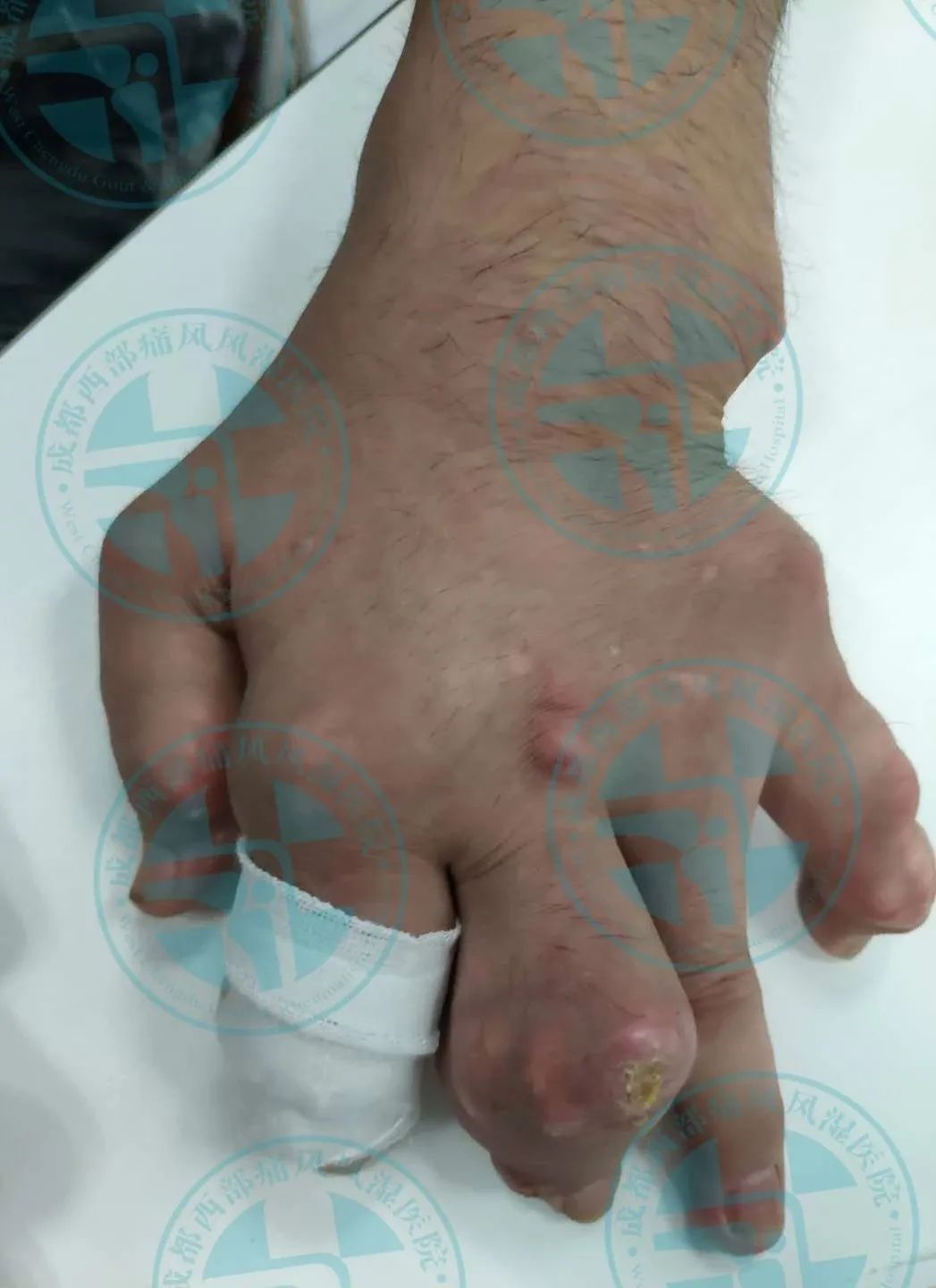 患者王先生10年前无明显诱因出现右足第一跖趾关节红肿、疼痛,在当地医院就诊经检查尿酸高(具体数值不详),确诊为“痛风性关节炎”,经口服消炎止痛药物后疼痛缓解(具体药名不详),10年来病情反复发作并逐渐累及双足、双踝、双膝、双肘、双手、双腕、双耳等关节并出现痛风石,期间每次疼痛发作时均以口服消炎止痛药物缓解症状(具体用药不详),2月前出现右下肢痛风石破溃并伴有粉笔灰状液体流出。