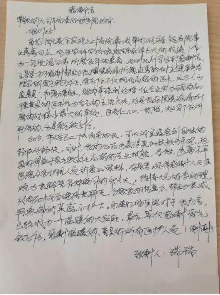 张先生的爱人送来的一封表扬信,字里行间都充满了感谢。对任毅主任精湛的医术充满佩服,对每一位护理人员充满感激。护理部的白衣天使每天穿奔波于病房与护士站之间,工作中不怕脏不怕累,丝毫不逊色于任何人。积极主动的帮助患者换药,更换床单,从早上的晨间护理到第二天早上的交班,总是忙忙碌碌、辛勤的工作着。她们的工作态度赢得了患者的信任,得到了家属的肯定。