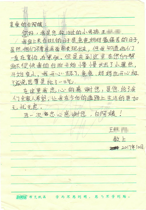 前段时间10岁白癜风男孩因为心疼父母,用墨水涂白斑的事情引发了很多媒体及网友的关注,孩子的行为更是感动了无数网友,也牵动着无数人的心。不过最近他的病情又有了变化,原来在主治医生白淑芳主任的治疗下,他的白斑慢慢缩小,病情开始好转,看到这个变化后,他和爸爸妈妈开心极了。为此,他写了一封简短的感谢信,感谢白淑芳主任为他们一家人带去了生活的希望。