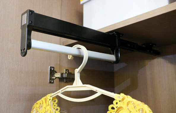 女人的衣柜总是会缺少一件衣服,为了给更多的衣服留下生存空间。在六期精装房的入户门柜中,采用可伸缩衣杆,一个衣杆双倍容量,每一件衣服都有属于自己的空间。为延长衣柜使用寿命,每扇衣柜门都安装防变形条,让女主人的精致生活无所顾忌。