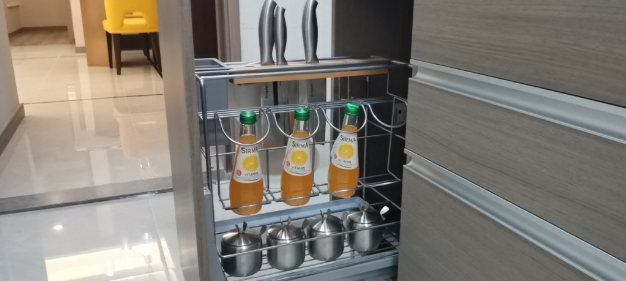 厨房内安装隐形厨具用品安置架,减少父母或孩子不注意所带来的安全隐患,同时将整洁的操作台面归还于厨房。