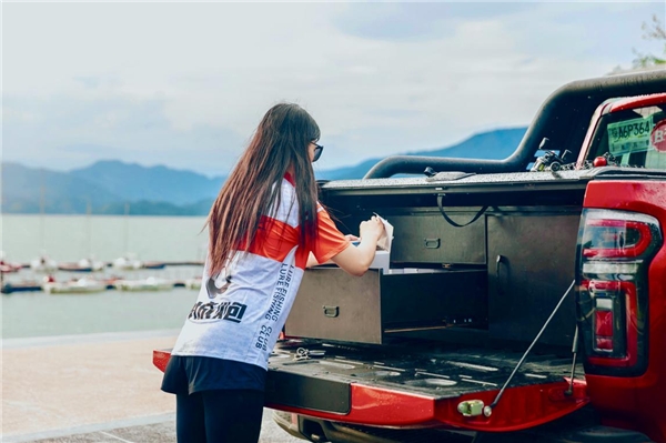 正是得益于越级的动力以及9500磅的绞盘支持,长城炮越野皮卡在路亚国际锦标赛实在出色,仅一项轻松拖拽路亚艇前行,就让很多户外老炮儿刮目相看。此外,大家都知道此次路亚举办地黄山地形复杂、道路难行,长城炮越野皮卡搭载的三把锁、蠕行模式、坦克掉头等越野配置则为赛事的完美收官助攻不少:三把锁配合低速四驱模式,轻松应对软泥烂路;蠕行模式可将车辆控制在低速匀速行驶;TOD智能四驱可提供更稳定的车辆循迹性。