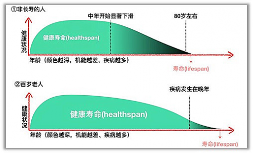 对比正常老人的衰老模式,科学家对众多“生存大师”百岁老人的跟踪研究发现,他们之所以会寿命更长久、身体也更健康的原因就在于,他们人到中年之后并不会像普通人那样出现体力、精力大幅下滑,而是呈现一种缓慢下降的趋势,在这个过程当中,疾病也同样很少出现,因此他们的身体状况普遍都很健康。科学家将这种人体衰老的模式称为“健康衰老”。