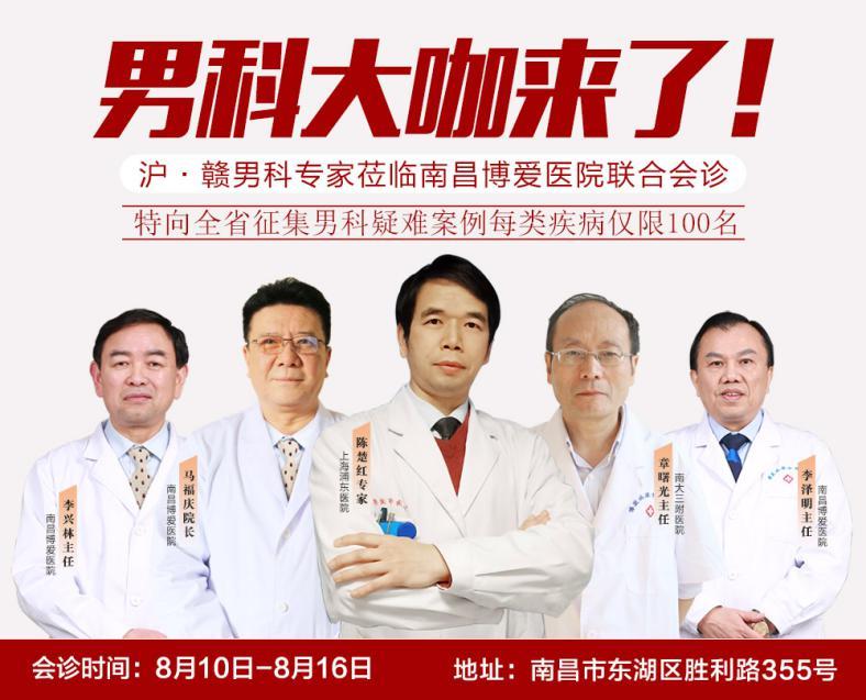 由中国医促会-泌尿生殖分会主办、南昌博爱泌尿专科医院(以下简称“南昌博爱医院”)承办的上海浦东医院男科专家陈楚红领衔现场/直播会诊暨“5G远程直播会诊室”启动仪式将于8月16日在昌召开,上海浦东医院、南昌大学第三附属医院等国内一线男科医学专家汇聚南昌!