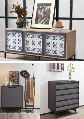 DNA电视柜、DNA玄关柜/五斗柜、DNA老榆木柜、DNA茶几,在这样充满欧式风情的家居环境里,该如何还原新中式设计而不违和呢?DNA电视柜古今结合,匠心独运,柜门运用艺术烤漆玻璃贴片工艺,中西融会,青出于蓝,纹样萃取柏厨“柏”字的造型元素,蓝白相映成趣,营造别具一格的东方意蕴。