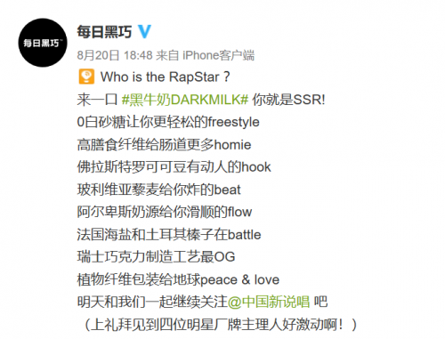 根据了解,每日黑巧在《新说唱》节目中的赞助并不是最高级别,在此档节目中植入的产品为新品“黑牛奶DARKMILK”系列,呈现方式有口播,还有选手们的互动场景等。据旗舰店详情页介绍,该产品定位零砂糖、高膳食纤维,与以往产品的差异为甜度提升,还加入其他精选原料,例如阿尔卑斯乳源、法国海盐、土耳其榛子、玻利维亚藜麦等。另外,包装采用环保概念的植物基可降解材料,让消费者以行动支持环保,打的是一种前端及健康的消费模式。而最巧妙的是,每日黑巧在传播和产品卖点上与《新说唱》的精神概念有高度匹配,每日黑巧的第一次节目传播预热,就喊出“说唱要每日,黑巧享自由!最rich的巧克力,最滑顺的flow!”的口号,在第二次节目传播时更是使用说唱用语来阐述新品的所有卖点,得到大量粉丝的追捧及赞赏。无论是产品和说唱文化的结合及传播的精神理念,每日黑巧都与《新说唱》节目非常适合。并且,在与每日黑巧官宣代言人刘雨昕提出的口号“追寻身心皆美的自由”不谋而合,因为说唱文化本来就是一种注重自我的表达,每日黑巧充分的将这些共性化为认同感,让粉丝能够用更有乐趣的方式了解产品,新品牛奶巧克力#黑牛奶DARKMILK#在微博上甚至已经有了近九千万的阅读量。不得不说,每日黑巧在营销和圈层方面都做的非常到位,希望在接下来的节目中,我们还能继续看到每日黑巧高光的传播表现。