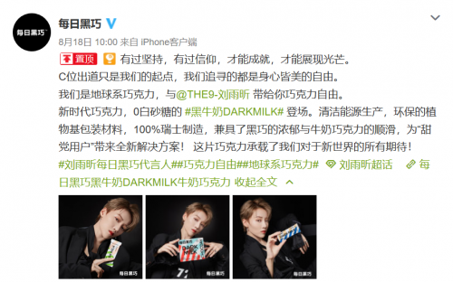 近期,每日黑巧品牌高频出现在消费者眼前,对于品牌个性的把控和传播的策略非常明确。在多平台上的内容推广也高度媒合品牌基调,如官宣首位品牌代言人刘雨昕,以及赞助国内S级综艺节目中国新说唱。