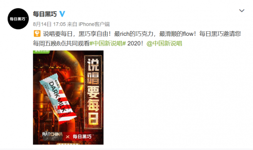 爱奇艺重量级节目《中国新说唱》第二季终于在2020年8月14日跟观众见面,超大制作,超强导师阵容,致使节目一上线,便引起热议,节目中的各项话题频繁登上热搜榜。节目中,赞助商除战马、自嗨锅等品牌外,也出现了个年轻的新势力品牌,那就是每日黑巧。