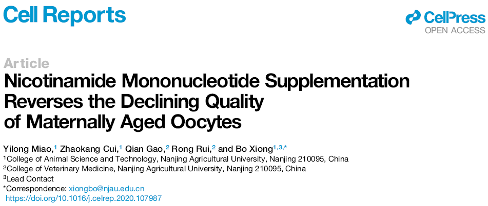 2020年8月4日,科研团队发表在顶级科研期刊《Cell》子刊上的研究结果显示:使用NMN能恢复中年女性生育能力【1】。此前,2月18日由新南威尔士大学和哈佛大学等团队合作,发表的题为《NAD+ Repletion Rescues Female Fertility during Reproductive Aging》【2】的研究结果曾首次提出卵母细胞质量与NAD+水平之间有密切联系,中国科技部还做了相关报道【3】。