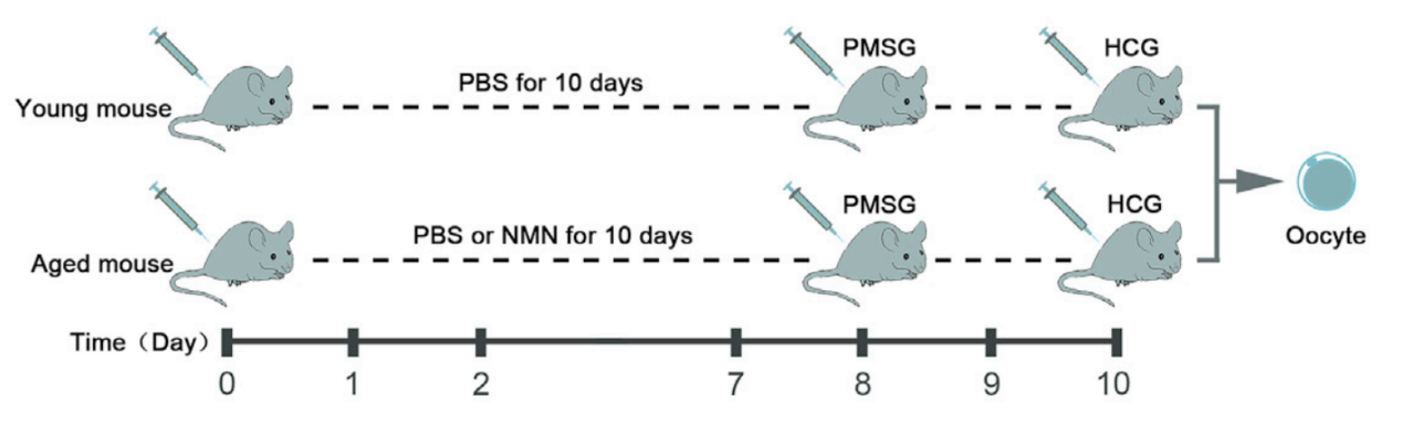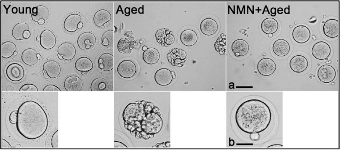 为了探索NMN在老龄雌性动物生殖系统中的作用,研究人员对生育能力出现衰退的老年雌性小鼠(14-16月龄),连续注射10天NMN(200mg/Kg体重)后,发现补充NMN后卵母细胞得到恢复,卵子的数量和质量都得到很大的提升。