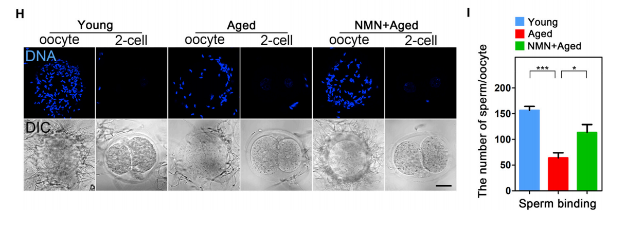 研究人员通过精子-卵母细胞结合试验发现,老年卵母细胞与年轻卵母细胞相比,与精子结合的能力明显降低。补充NMN后,老年卵母细胞与精子的结合能力得到显著提高。由此可见,补充NMN提高了老年卵母细胞的受精能力和早期胚胎发育。