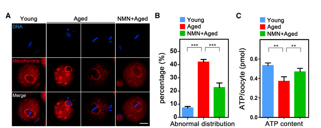 观察发现,年轻卵母细胞中的线粒体,通常会集中分布在染色体的周边,但随着年龄的增长,这些线粒体会逐渐远离染色体,进入细胞质,研究人员认为,线粒体的异常分布,极有可能暗示着线粒体的功能随着卵母细胞的衰老而受损,测试结果证实了这一猜想。在补充NMN后,老年小鼠卵母细胞中分散在细胞质中的线粒体,重新移动回了染色体的周围,而且这些线粒体的ATP生产能力等重要指标,全部被恢复至了年轻水平。从数量上来说,老年卵母细胞会有超过40%分布异常的线粒体,补充NMN后会降低到24%。