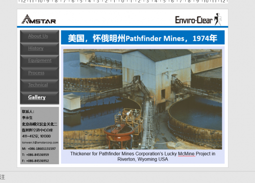 艾姆斯特(AMSTAR ENVIRO-CLEAR)的浓密机产品在全球范围内得到应用,其中,在中国地区,艾姆斯特(AMSTAR ENVIRO-CLEAR)自1984年向张家口金矿提供了第一台直径17英尺的高效浓密机(可能是中国的第一台高效浓密机)起,1992年向贵州翁福新龙坝选厂提供直径50英尺的高效浓密机;1992年向黄麦岭磷矿提供了直径23英尺的高效浓密机;1995年向神华大柳塔煤矿提供了两台直径30米的高效浓密机;1995年向张家口金矿提供了第二台直径17英尺的高效浓密机;2002年向贵州翁福马场坪磷矿提供了直径50英尺的高效浓密机……,如今已在中国地区提供的浓密机等设备近40台,详见后附的业绩表,国内客户包括:马坑矿业,江铜集团,中冶集团、山东黄金、云锡集团、河北钢铁、北方工业、南京钢铁、昆钢集团、内蒙地矿、金川集团、神华集团,瓮福集团等。