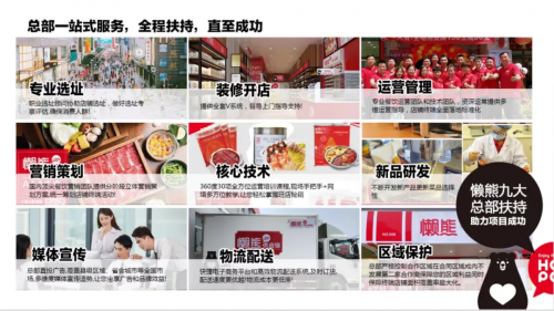 懒熊共享财富 只找合伙人:与传统的连锁加盟不同。懒熊崇尚合伙人制,客户只要与懒熊火锅食材合作,总部将提供全面的加盟扶持。比如选址服务支持、装修指导支持、区域保障支持、物流配送支持、产品研发支持、系统培训支持、营销策划支持、品牌宣传支持等。全方位保证合伙人的利益。