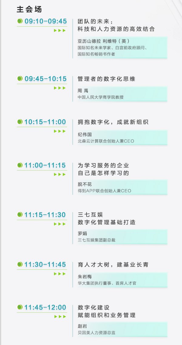 本届大会可谓是“高手云集”、群英荟萃。国际知名未来学家、白宫前政府顾问、国际知名畅销书作者亚历山德拉利维特(英国),中国人民大学商学院/MBA中心主任、组织创新与人力资本战略教学杰出教授周禹,得到APP联合创始人兼CEO脱不花,三七互娱集团副总裁罗娟,华大集团执行董事、首席人才官朱岩梅,贝因美股份有限公司人力资源总监赵岩将分别在上午场为大家带来最新行业趋势洞察,与您探讨新商业环境和新技术浪潮下的组织人才管理之道。而北森云计算联合创始人兼CEO纪伟国则将为大家带来北森iTalentX全线产品的升级,为大家展示一个一体化、敏捷化、智能化的HR SaaS。