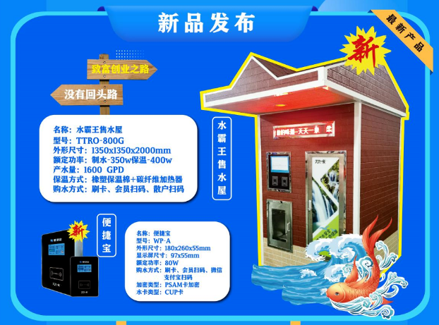 北京天天传奇集团作为中国净水设备行业的优秀企业,每年都有功能前卫强大、性能独特智能安全、性价比非常优越的新产品上市。本次新上市的四款产品:水霸王售水屋,大黑龙、小白龙智能电开水机和便捷宝智能升级系统。