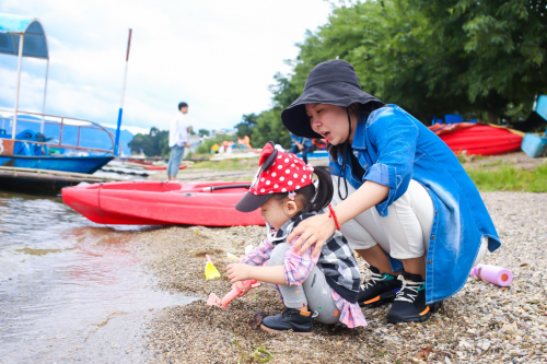 在岸边,小朋友们在父母的看护下,也过了一把玩水的瘾,使用儿童挖沙工具,挖掘自己喜欢的鹅卵石,既拉近了亲子间的距离,也锻炼了孩童认识自然的能力。