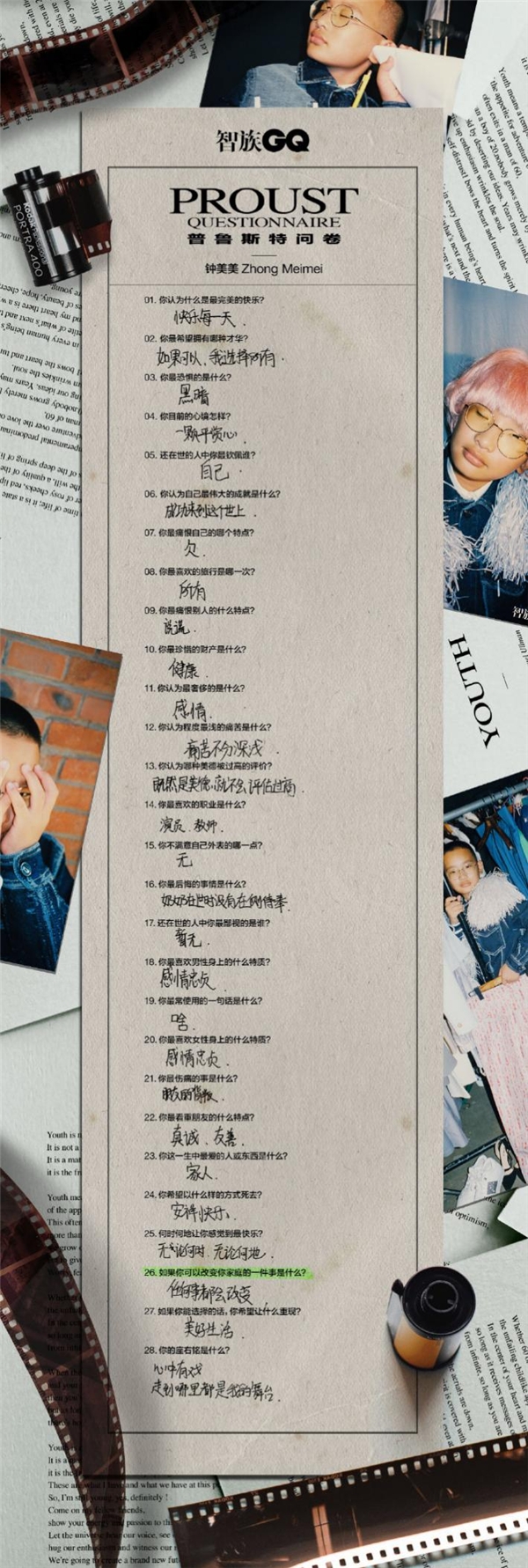 年轻人是怎样一群存在?钟美美的GQ普鲁斯特问卷刷屏了我的乐动-乐动(中国):“你认为程度最浅的痛苦是什么”,答曰“痛苦不分深浅”;“你的座右铭是什么”,答曰“心中有戏,走到哪里都是我的舞台”……这样的回答吸引了诸多先锋青年的认可,我们一边惊讶于他与年龄不相符的成熟,一边对他不被束缚的思维大加赞赏。毕竟,年轻人的标签就该是个性、独特、自信、打破束缚。