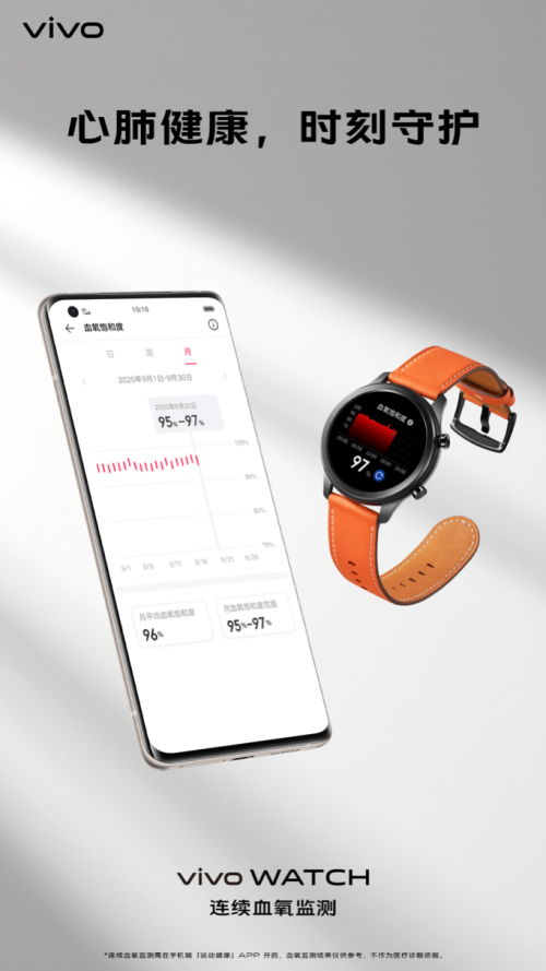 vivo WATCH提供24小时健康监测功能,能够实现连续血氧饱和度监测、全天候心率监测、睡眠监测、压力监测、呼吸监测和身体活力值监测,全方位关注用户健康。