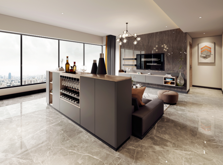 柏厨集成家居礼居Ⅱ,以极简的形式呈现整体风格,灰色烤漆面板质感化奢入俭,为全屋营造高级感。采用嵌入式隐形拉手工艺,外观更简洁,带来简单而平和的生活方式。在优雅的餐厅空间内,餐边柜采用一柜多用的设计,承担了酒柜和隔断柜的双角色,既是客厅与餐厅的边界,也是一家人情感交流的桥梁。右边设置抽屉方便收纳水果刀、开瓶器等小件物品;中间酒格顶部为托盘造型,增加放置物品的安全系数;左侧半开放柜可以使常用物品一目了然。