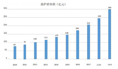 百亿的披萨市场一直是餐饮人争夺的“羔羊”之地,从2010年开始,每年营业额的增比都有显著提升,到了2015年,更是以每年增幅30亿以上的发展速度,不断刷新着每年的披萨营业额。