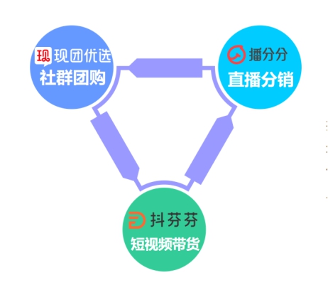 成立于2019年12月9日的现团优选,以小程序的形式集成于微信内,在社群内实现团购和直播带货,这是它第一个赚钱的途径;同时,现团优选还与另一款小程序“播分分”合作,让直播链接可以直接在微信对话框中发送,直播带货成为了第二个赚钱的途径;第三,就是在一款叫“抖分分”的小程序中,按教程制作相应的产品短视频,并将短视频发送到抖音,同时在商品橱窗附上产品链接,抖音用户就可以在商品橱窗中就进行购买,这就是抖音分销。同样是卖一款产品,在现团优选里,可以掌握三个不同的销售渠道。