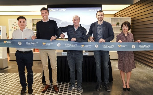 Club Med大南区销售总监常晴(左一),Club Med中国区市场及销售资深副总裁潘胜森 Sebastien Portes(左二), Club Med亚太市场销售事业部首席执行官戴杰伟Xavier Desaulles(左三),Thomas Cook 托迈酷客总经理戴安哲Alessandro Dassi(右二),Thomas Cook 托迈酷客首席营销官陈颖(右一)剪彩