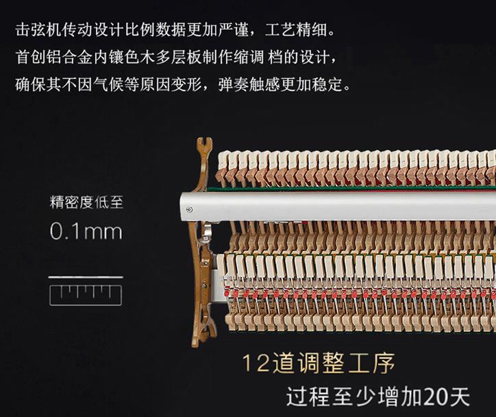 投入了大量的资金进行研发以及专利的创作。最终铸就了133cm的黄金高度,采用卡纳尔制琴研究团队全新一代的马克,大腔体音源系统设计,使音色更加圆润饱满。选材上采用了德国进口高含量羊毛毡,更耐用的弦槌,澳大利亚第五代进口纯羊毛,卡纳尔独家专利弦槌技术,羊毛密度+18,十万次敲击后弹性始终如一。